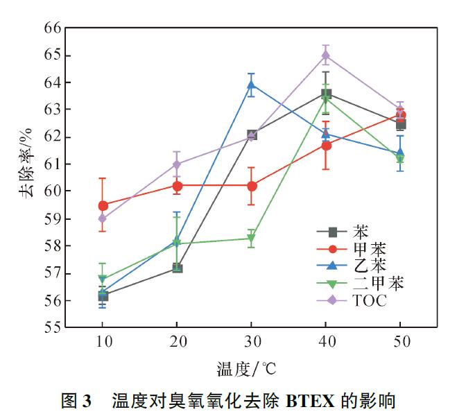 本實驗的主要目標(biāo)是尋找臭氧降解BTEX的 很佳反應(yīng)溫度。實驗設(shè)定5個溫度變量,分別為10℃、20℃、30℃、40℃、50℃。實驗中目標(biāo)有機物的去除效率以TOC的濃度變化來評定。溫度對臭氧氧化去除BTEX的影響如圖3所示。