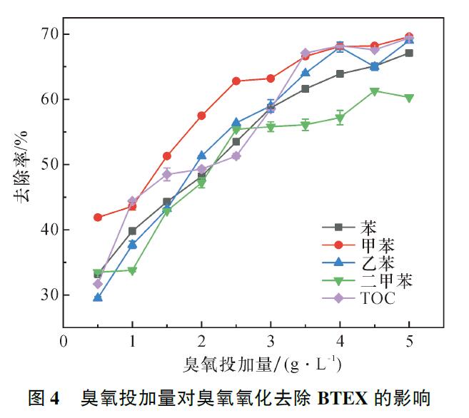 臭氧的通氣量直接影響目標(biāo)有機污染物的降解效果和實際處理過程中的工藝成本。根據(jù)前人的研究成果可知,臭氧濃度越高則有機物去除率越大。但在實際處理過程中,考慮運行成本等因素,不能一味增加臭氧投加量來提高反應(yīng)效率。因此,本研究主要探索臭氧投加量對BTEX去除的影響(圖4)。