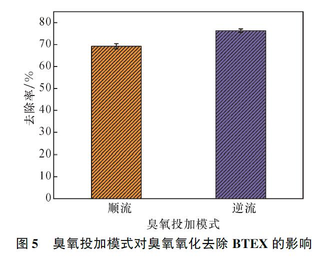 從圖5可以看出,當(dāng)昊氧的投加模式為順流時,BTEX的去除效率為69.2%;當(dāng)臭氧的投加模式為逆流時,其降解效率為76.3%,增加了7.1%。