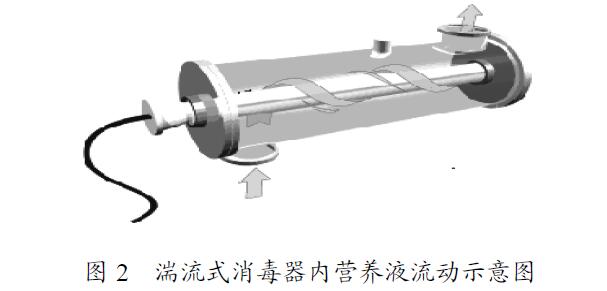 針對上述問題,自行設(shè)計(jì)了一種新型的紫外線消毒器[17]:在消毒腔體內(nèi)安裝螺旋形導(dǎo)流片,使?fàn)I養(yǎng)液以湍流形式流動(dòng)(圖2),即讓沿不銹鋼腔體內(nèi)壁流動(dòng)的營養(yǎng)液也有一部分時(shí)間是在石英套管附近流動(dòng)。營養(yǎng)液在距離紫外燈管較近或較遠(yuǎn)的兩個(gè)區(qū)域停留的時(shí)間接近,從而解決了因一部分營養(yǎng)液滅菌不徹底而影響整體滅菌效果的問題。