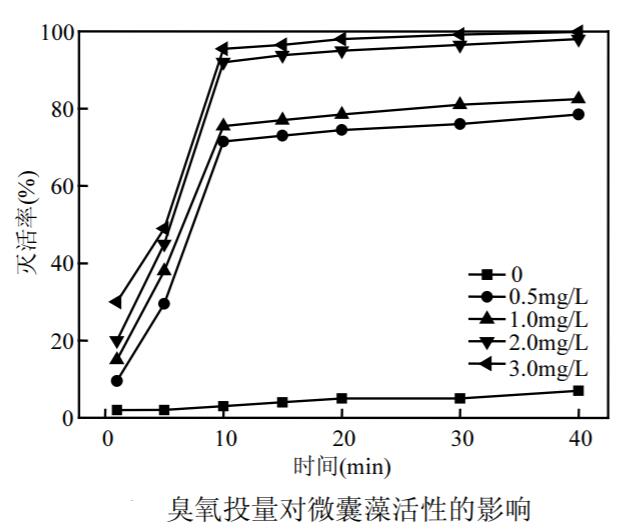 1.臭氧滅活銅綠微囊藻與其濃度和作用時(shí)間都有關(guān)系,隨著臭氧濃度和作用時(shí)間的延長(zhǎng),藻滅活率明顯增加, 很高去除率達(dá)到 99.0%(初始藻細(xì)胞密度 1.0×107個(gè)/L,臭氧濃度 2.0mg/L,作用時(shí)間40min,濁度為 1.0 NTU,溫度 25℃, pH 7.5).