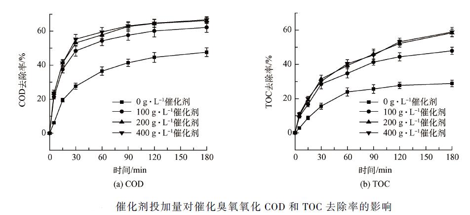 臭氧是有機(jī)物降解的直接動(dòng)力,其投加量直接影響催化臭氧氧化的速率及效果。實(shí)驗(yàn)通過調(diào)節(jié)所用臭氧發(fā)生器電流檔位改變臭氧投加量,并用碘量法測(cè)出臭氧產(chǎn)生量。廢水不調(diào)節(jié)pH 值(中性),催化劑投加量為200 g·L - 1 。由圖3 可知,不通臭氧,單純通空氣時(shí),催化劑對(duì)廢水只有吸附作用,此時(shí)COD 和TOC 的去除率僅有(8. 6 ± 0. 3)% 和(12. 1 ± 0. 4)% 。增大臭氧投加量對(duì)COD 和TOC 的去除率的提有限,這可能與臭氧的利用率有關(guān),有效利用的臭氧較少,但增大臭氧投加量,有利于三相界面的傳質(zhì),反應(yīng)速率更快,特別是在短時(shí)間內(nèi)效果顯著。