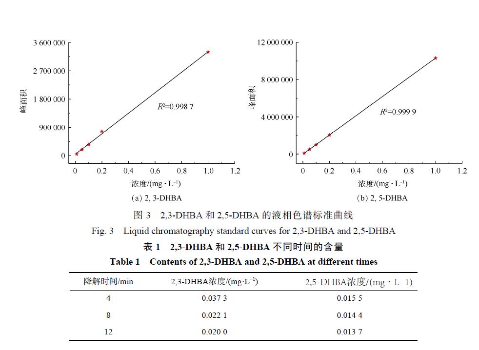 水楊酸 (SA)羥基化實(shí)驗(yàn)是另外一種間接檢測(cè)羥基自由基的方法。羥基自由基具有存在時(shí)間短、不穩(wěn)定的特點(diǎn),但 SA可以作為 · OH的捕捉劑,SA與 · OH反應(yīng)后會(huì)生成較為穩(wěn)定的 2,3-二羥基苯甲酸 (2,3-DHBA)和 2,3-二羥基苯甲酸 (2,5-DHBA)。本研究結(jié)合紫外-可見(jiàn)分光光度計(jì)跟蹤 SA與 · OH反應(yīng)后產(chǎn)物,再結(jié)合液相色譜-質(zhì)譜聯(lián)用儀對(duì)2,3-DHBA和2,5-DHBA 進(jìn)行定量分析。