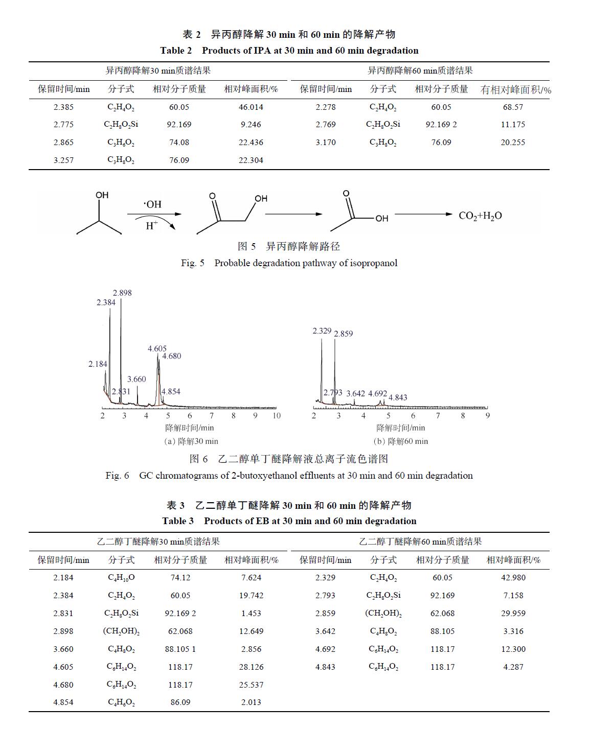 乙二醇單丁醚降解 30 min和 60 min后的總離子流色譜圖如圖 6所示,對(duì)應(yīng)的中間產(chǎn)物信息如表 3所示。乙二醇單丁醚的降解中間產(chǎn)物主要有 1-丁醇、乙二醇、4-羥基-2-丁酮、丁內(nèi)酯和乙酸。