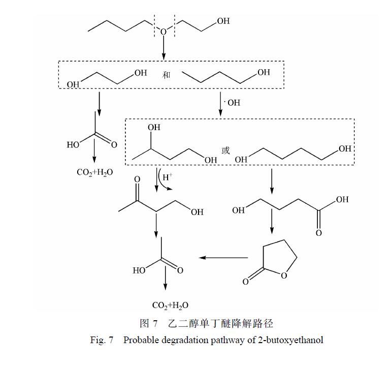 由此可以推測(cè)乙二醇單丁醚的可能降解路徑如圖 7所示,乙二醇單丁醚的降解一部分是被氧化斷鏈形成乙二醇,然后再接著被氧化為乙酸。