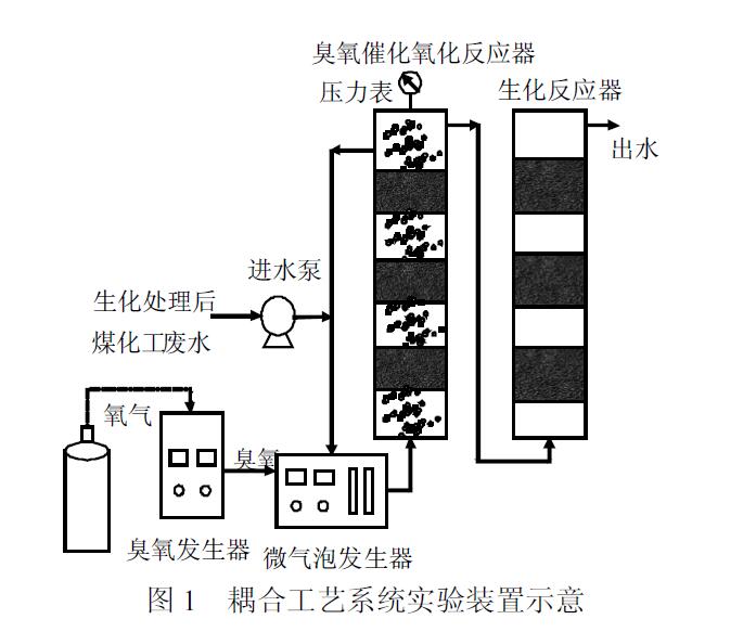 本研究采用微氣泡臭氧催化氧化-生化耦合工藝,對某實際煤化工廢水生化出水進行深度處理.水質分析表明,該廢水生化出水存在大量含氮雜環(huán)芳烴類污染物,可生化性極差,傳統(tǒng)曝氣生物濾池(BAF)對其COD去除率僅6.4%,難以采用生化工藝直接處理.本研究采用微氣泡臭氧催化氧化含氮雜環(huán)芳烴類污染物,提高廢水可生化性并去除部分COD,而后采用生化處理進一步去除COD 和氨氮.此外,還考察了微氣泡臭氧催化氧化-生化耦合處理去除污染物性能,并分析了處理過程中含氮雜環(huán)芳烴類污染物降解和可生化性變化,以期為該耦合工藝應用于煤化工廢水深度處理和含氮雜環(huán)芳烴類污染物去除提供參考.