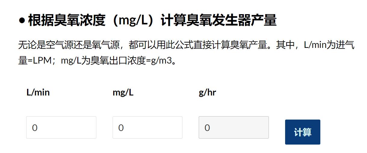 下面是同林開發(fā)的一款在線計算工具,輸入氣量和濃度,直接可以得出臭氧產(chǎn)量。