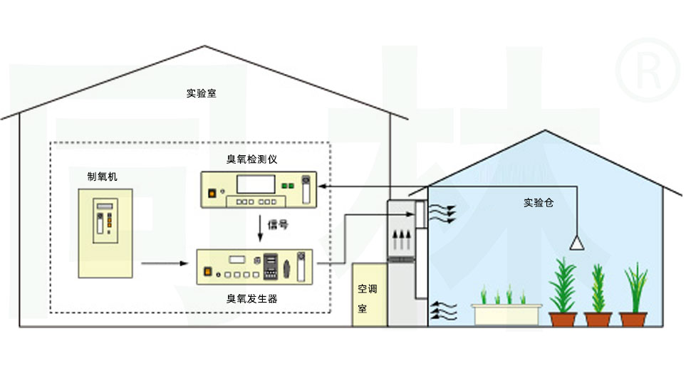 這是一個(gè)臭氧暴露系統(tǒng)的例子,用于測(cè)試臭氧對(duì)植物和其他植物的影響,使用現(xiàn)有的中型腔室(例如,玻璃腔室)。