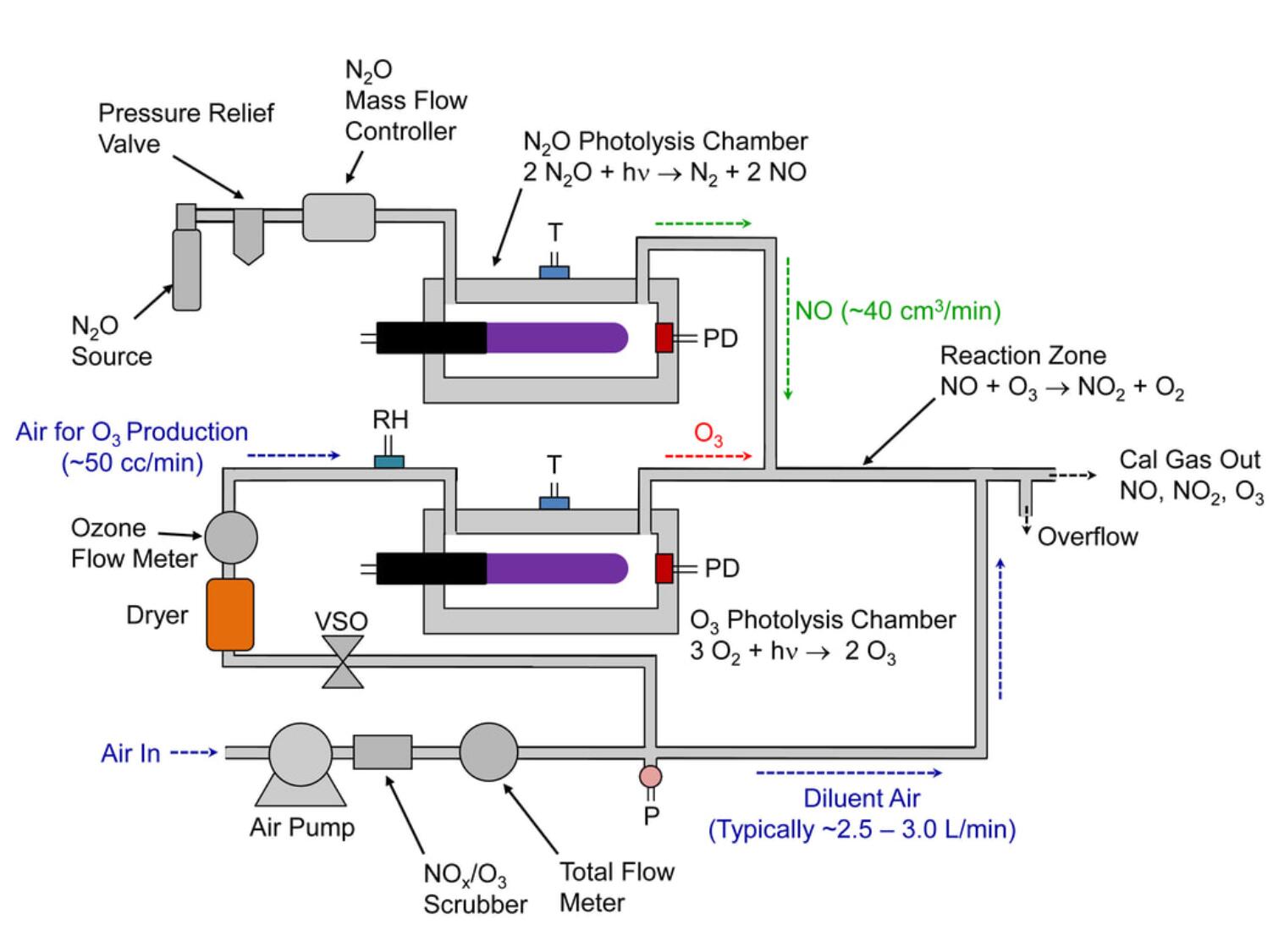 美國2B 714 型 NO 2 /NO/O 3 Calibration Source ™結(jié)合了 2B Technologies 的 306 型臭氧校準(zhǔn)源™ 和 408 型一氧化氮校準(zhǔn)源™ 以產(chǎn)生 O 3、NO 和 NO 2的校準(zhǔn)源。714 型使用兩個低壓汞燈,一個用于光解氧氣以產(chǎn)生 O 3,另一個燈用于光解一氧化二氮 (N2 O ) 以產(chǎn)生 NO。在 O 3與過量的 NO 將 NO 轉(zhuǎn)化為 NO 2的化學(xué)計量反應(yīng)中產(chǎn)生二氧化氮。714 型的示意圖如下所示: