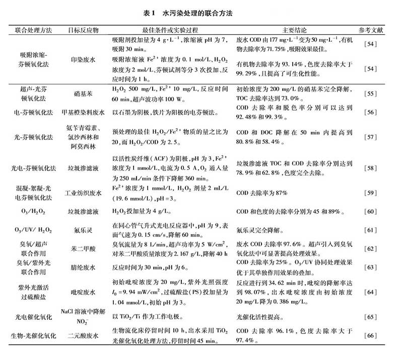 高級(jí)氧化技術(shù)(AOPs)高效、使用范圍廣、處理效果優(yōu)異,但其基礎(chǔ)理論還不十分完善,且實(shí)際污染系統(tǒng)復(fù)雜多樣,存在處理成本高、反應(yīng)條件苛刻、反應(yīng)器復(fù)雜等問(wèn)題。將高級(jí)氧化技術(shù)復(fù)合使用或與其他技術(shù)相結(jié)合,可發(fā)揮其協(xié)同作用,強(qiáng)化污染物處理效果。