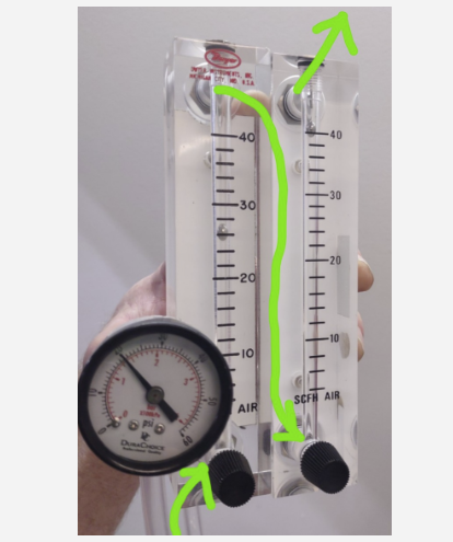 當氣體,無論是空氣還是氧氣,通過流量計加壓時,流量計將讀取不準確的流量。下圖顯示了兩個相同的流量計并排,從氧氣濃縮器流過每個流量計的氧氣量相同。左邊的流量計壓力為20 psi,右邊的流量計壓力為0 psi。盡管流經(jīng)流量計的氧氣量是相同的,但流量讀數(shù)是不同的。在壓力下,流量計的讀數(shù)將低于實際流量。