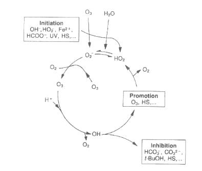 自由基反應(yīng)的引發(fā)劑是能夠從臭氧分子誘導形成超氧離子O2的那些化合物。這些是無機化合物(羥基離子OH-,氫過氧化物離子HO2 - 和一些陽離子),有機化合物(乙醛酸,甲酸,腐殖質(zhì)......)和253.7 nm的紫外線輻射。
