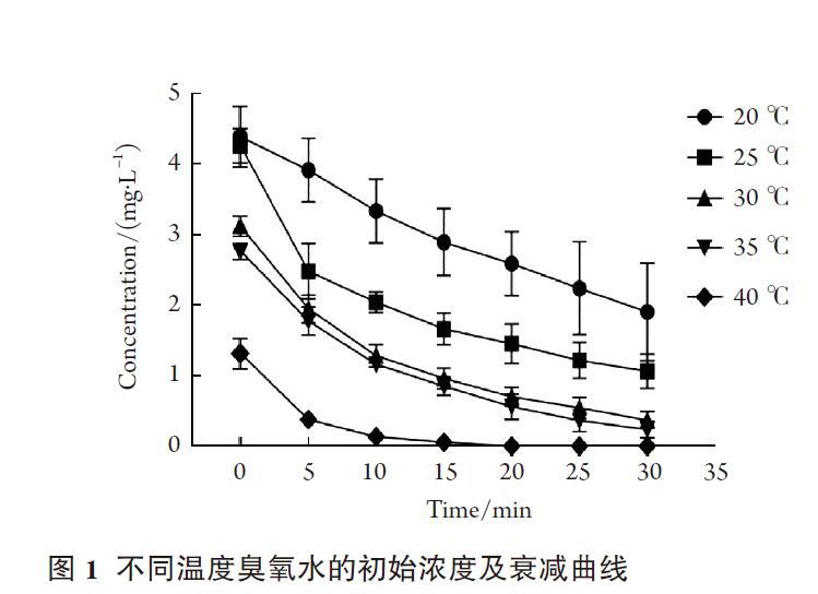 檢測(cè)水溫分別為20,25,30,35及40 ℃臭氧水的初始濃度并分別測(cè)定室溫(25 ℃)下以上不同溫度的臭氧水在分別靜置5,10,20,及30 min后的臭氧水濃度。