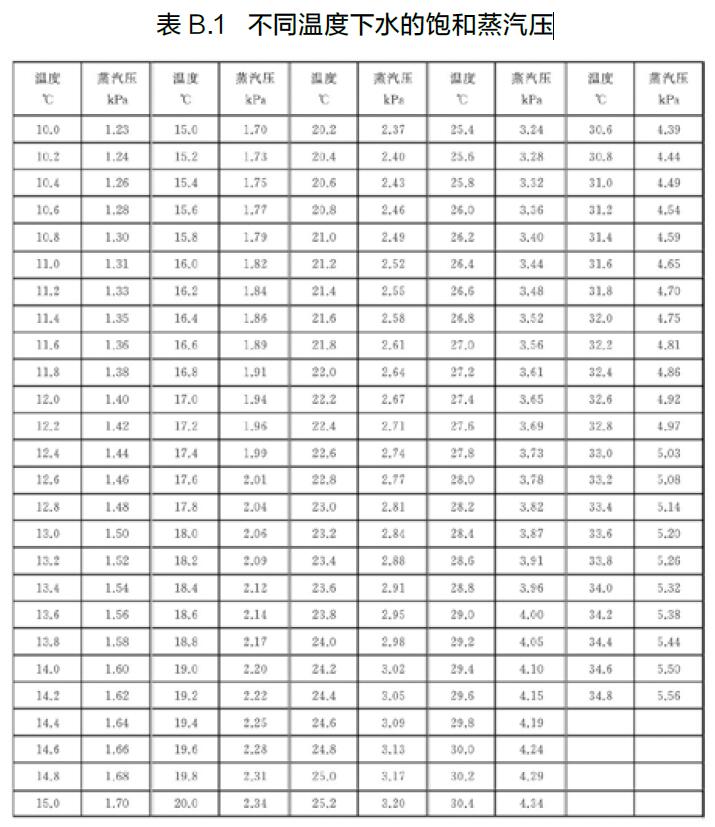 p v —— 飽和水蒸氣壓,單位為千帕(kPa),跟濕式流量計(jì)的溫度有關(guān),參見(jiàn)表B.1;
